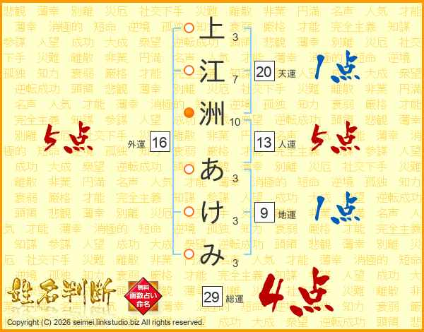 生活面を象徴する運勢です。外部から受ける影響力を表し、結婚運、家庭運や職場、環境への順応性を表します。総運から人運を引いた画数。姓や名が1文字の場合を除く。