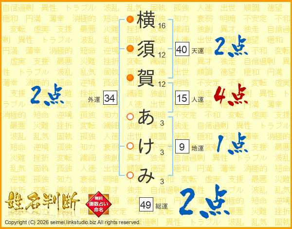 横須賀あけみさんの総運は49画の2点!