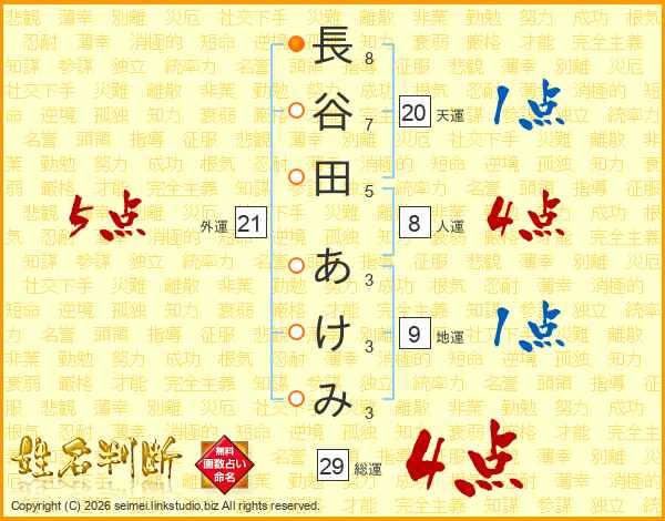 長(8画)谷(7画)田(5画) あ(3画)け(3画)み(3画)
