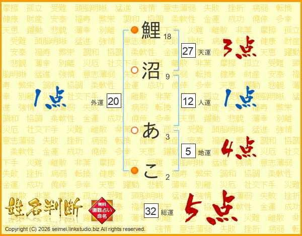鯉沼あこさんの総運は32画の5点!
