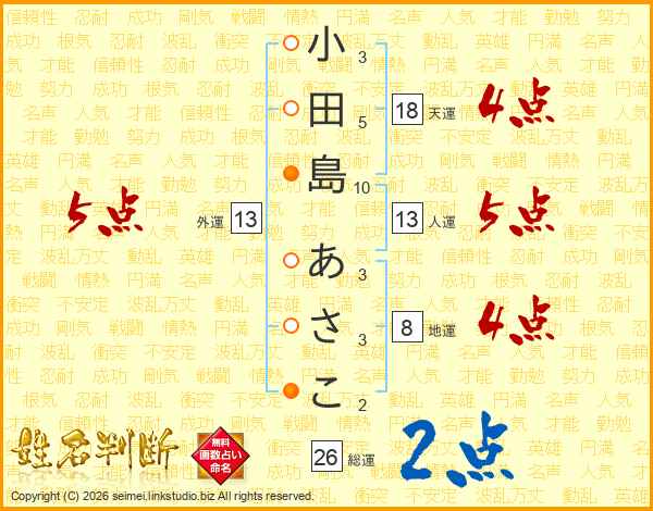 生活面を象徴する運勢です。外部から受ける影響力を表し、結婚運、家庭運や職場、環境への順応性を表します。総運から人運を引いた画数。姓や名が1文字の場合を除く。