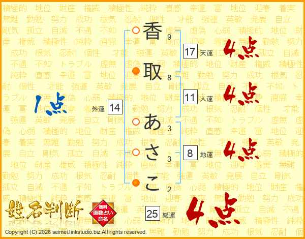 香取あさこさんの総運は25画の4点!