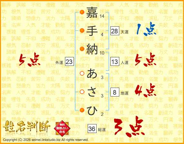 嘉(14画)手(4画)納(10画) あ(3画)さ(3画)ひ(2画)