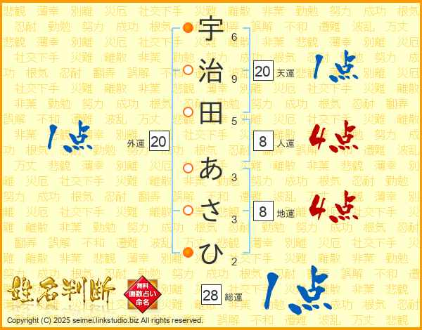 宇(6画)治(9画)田(5画) あ(3画)さ(3画)ひ(2画)