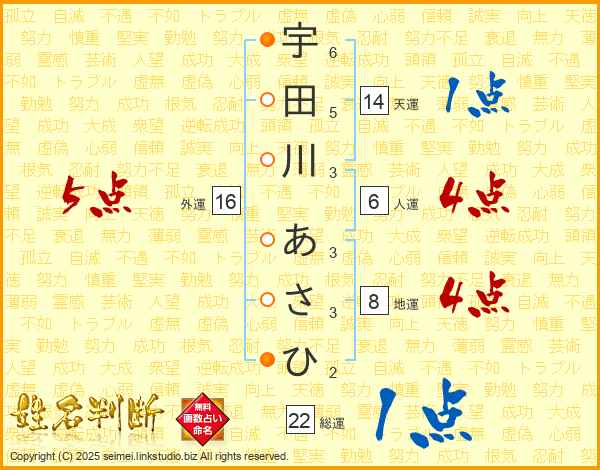 宇田川あさひさんの総運は22画の1点!