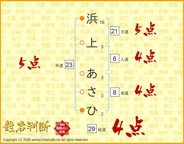 浜上あさひさんの総運は29画の4点!