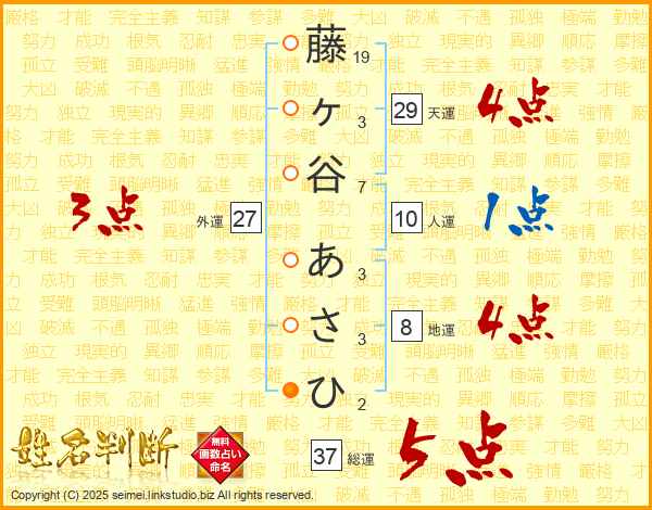 藤(19画)ヶ(3画)谷(7画) あ(3画)さ(3画)ひ(2画)