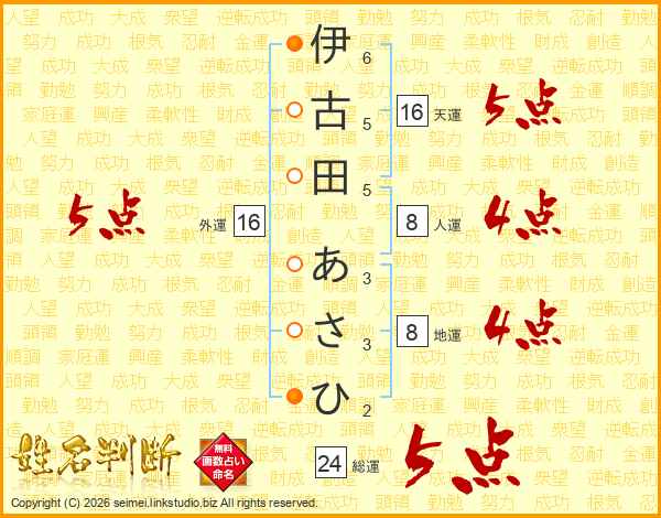 伊(6画)古(5画)田(5画) あ(3画)さ(3画)ひ(2画)