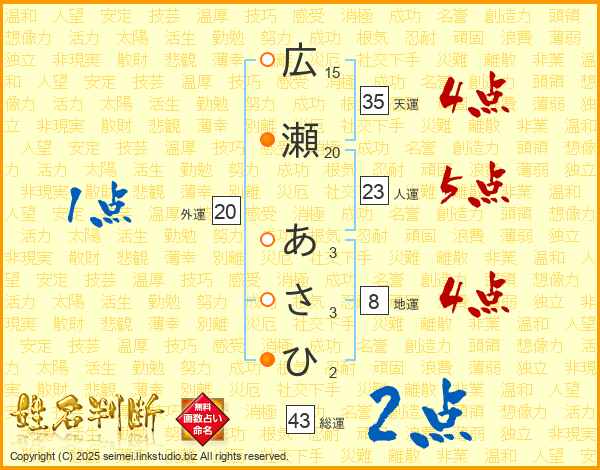 広(15画)瀬(20画) あ(3画)さ(3画)ひ(2画)