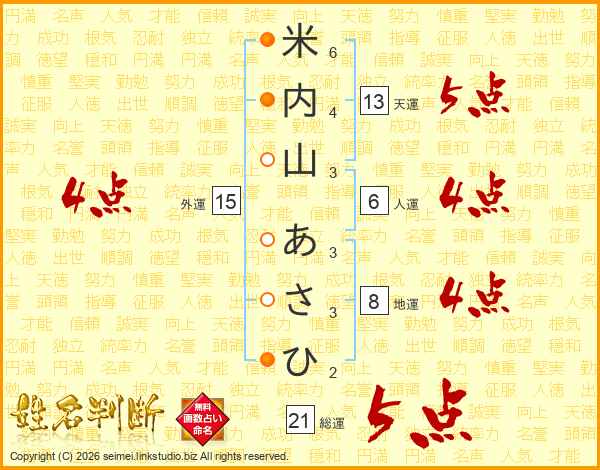 米内山あさひさんの天運は13画の5点!