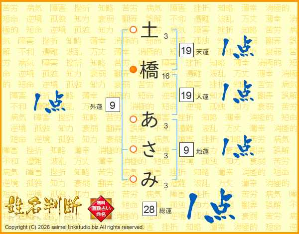 生活面を象徴する運勢です。外部から受ける影響力を表し、結婚運、家庭運や職場、環境への順応性を表します。総運から人運を引いた画数。姓や名が1文字の場合を除く。