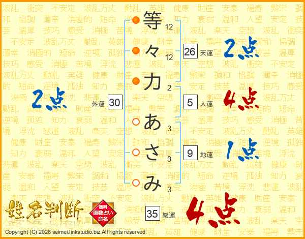 生活面を象徴する運勢です。外部から受ける影響力を表し、結婚運、家庭運や職場、環境への順応性を表します。総運から人運を引いた画数。姓や名が1文字の場合を除く。