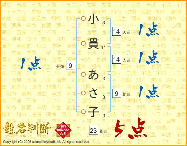 小貫あさ子さんの天運は14画の1点!