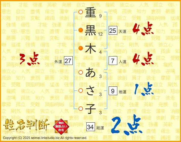 重(9画)黒(12画)木(4画) あ(3画)さ(3画)子(3画)