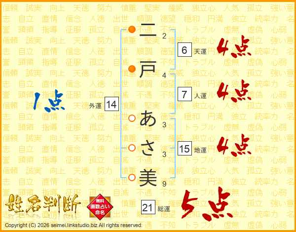 二戸あさ美さんの総運は21画の5点!