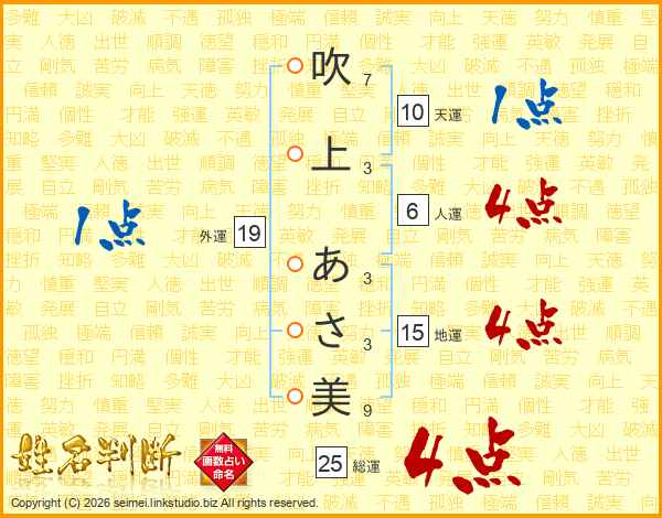 吹(7画)上(3画) あ(3画)さ(3画)美(9画)