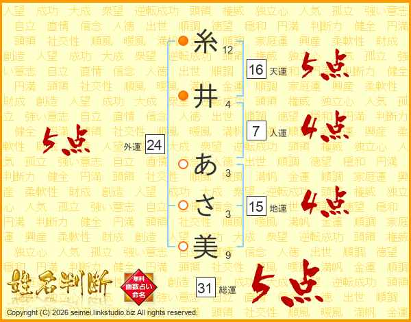 糸(12画)井(4画) あ(3画)さ(3画)美(9画)
