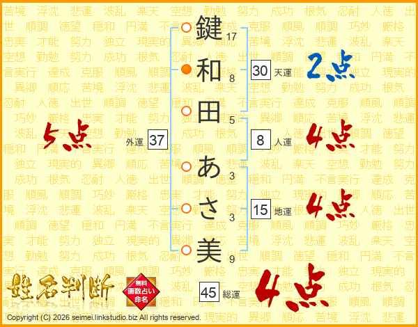 鍵和田あさ美さんの総運は45画の4点!