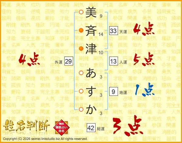 美(9画)斉(14画)津(10画) あ(3画)す(3画)か(3画)