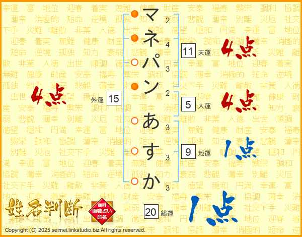 マ(2画)ネ(4画)パ(3画)ン(2画) あ(3画)す(3画)か(3画)