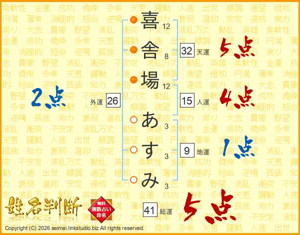 喜舎場あすみさんの天運は32画の5点!