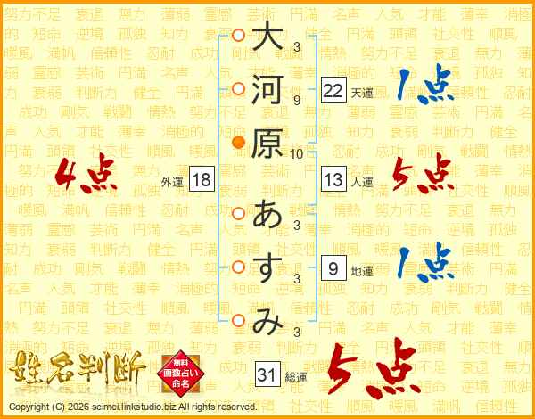 生活面を象徴する運勢です。外部から受ける影響力を表し、結婚運、家庭運や職場、環境への順応性を表します。総運から人運を引いた画数。姓や名が1文字の場合を除く。