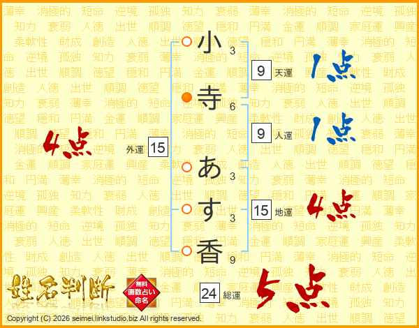 小(3画)寺(6画) あ(3画)す(3画)香(9画)