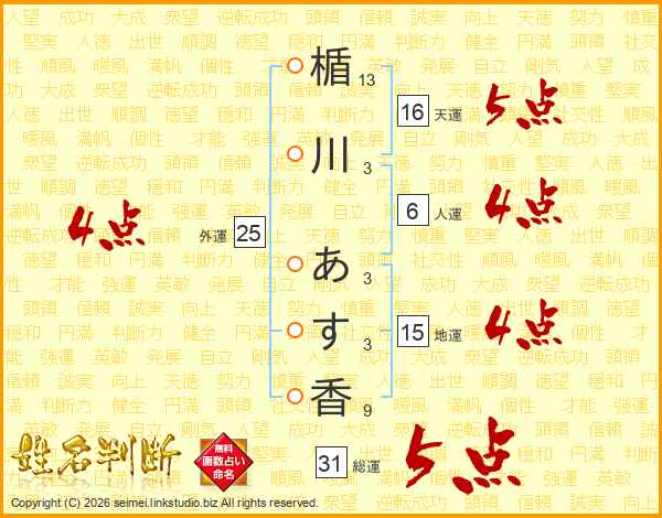 生活面を象徴する運勢です。外部から受ける影響力を表し、結婚運、家庭運や職場、環境への順応性を表します。総運から人運を引いた画数。姓や名が1文字の場合を除く。