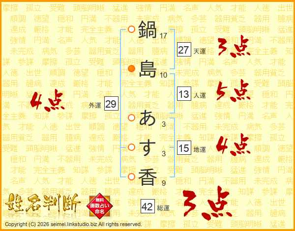 鍋(17画)島(10画) あ(3画)す(3画)香(9画)