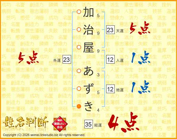 加(5画)治(9画)屋(9画) あ(3画)ず(5画)き(4画)
