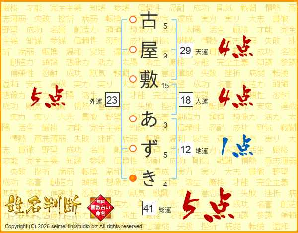 古(5画)屋(9画)敷(15画) あ(3画)ず(5画)き(4画)
