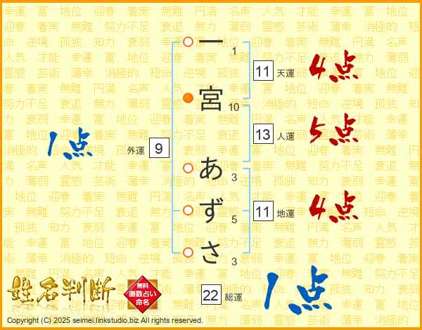 生活面を象徴する運勢です。外部から受ける影響力を表し、結婚運、家庭運や職場、環境への順応性を表します。総運から人運を引いた画数。姓や名が1文字の場合を除く。