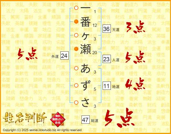 あなたの人生を表す1番重要な運勢です。生涯を通じて影響する総合運となり、主に50歳以降の晩年期に影響を及ぼします。苗字と名前の合計画数。