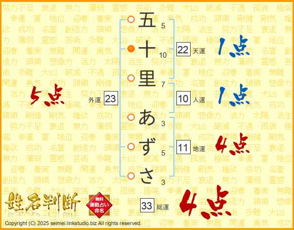 生活面を象徴する運勢です。外部から受ける影響力を表し、結婚運、家庭運や職場、環境への順応性を表します。総運から人運を引いた画数。姓や名が1文字の場合を除く。