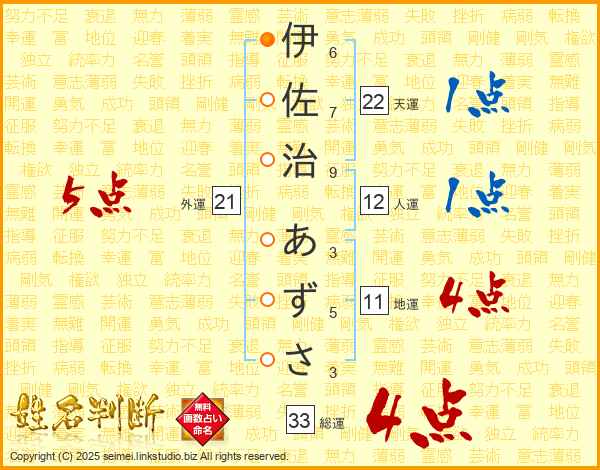 伊(6画)佐(7画)治(9画) あ(3画)ず(5画)さ(3画)