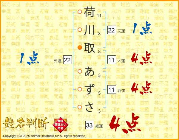 生活面を象徴する運勢です。外部から受ける影響力を表し、結婚運、家庭運や職場、環境への順応性を表します。総運から人運を引いた画数。姓や名が1文字の場合を除く。