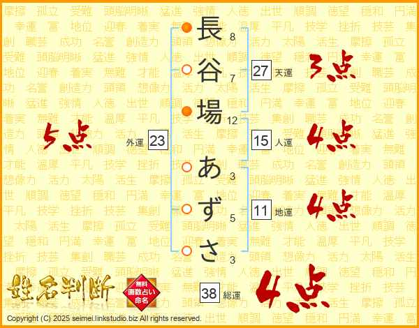 長(8画)谷(7画)場(12画) あ(3画)ず(5画)さ(3画)