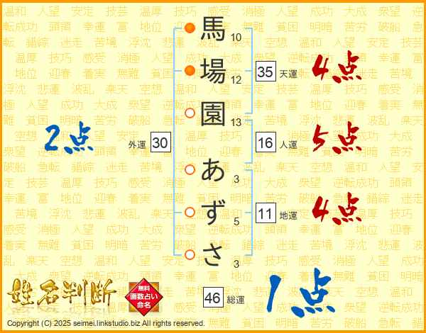 生活面を象徴する運勢です。外部から受ける影響力を表し、結婚運、家庭運や職場、環境への順応性を表します。総運から人運を引いた画数。姓や名が1文字の場合を除く。
