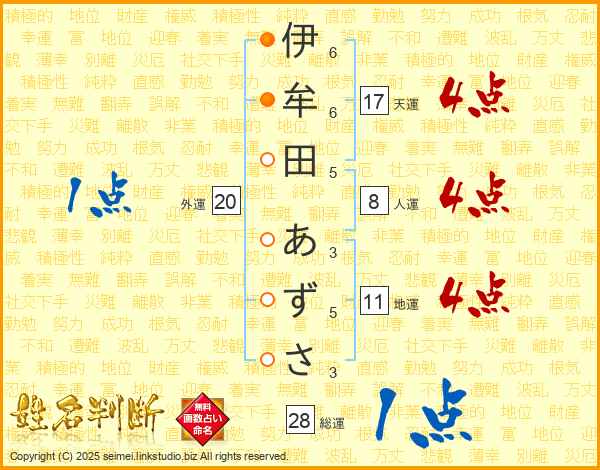 伊(6画)牟(6画)田(5画) あ(3画)ず(5画)さ(3画)