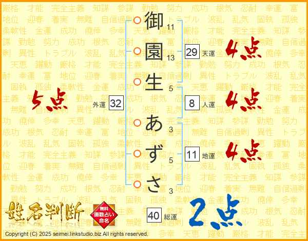 御(11画)園(13画)生(5画) あ(3画)ず(5画)さ(3画)
