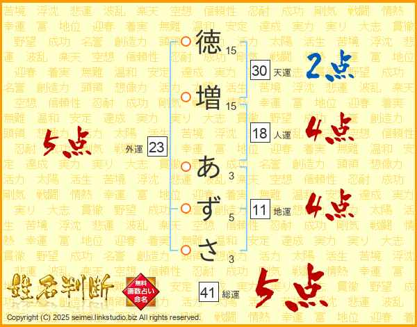 徳(15画)増(15画) あ(3画)ず(5画)さ(3画)
