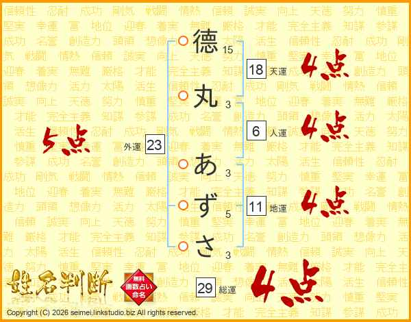 德(15画)丸(3画) あ(3画)ず(5画)さ(3画)