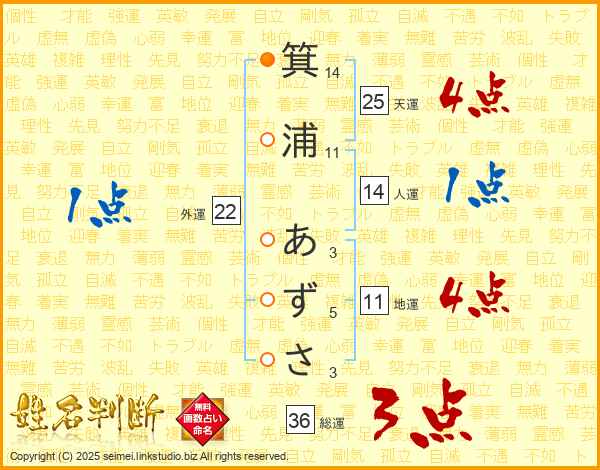 生活面を象徴する運勢です。外部から受ける影響力を表し、結婚運、家庭運や職場、環境への順応性を表します。総運から人運を引いた画数。姓や名が1文字の場合を除く。