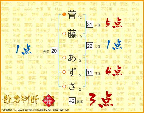 菅(12画)藤(19画) あ(3画)ず(5画)さ(3画)
