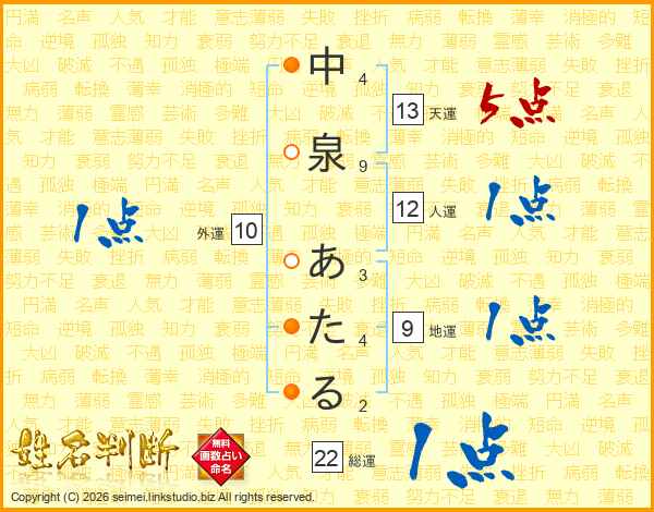中(4画)泉(9画) あ(3画)た(4画)る(2画)