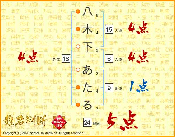 生活面を象徴する運勢です。外部から受ける影響力を表し、結婚運、家庭運や職場、環境への順応性を表します。総運から人運を引いた画数。姓や名が1文字の場合を除く。