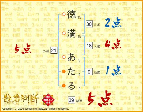 徳(15画)満(15画) あ(3画)た(4画)る(2画)