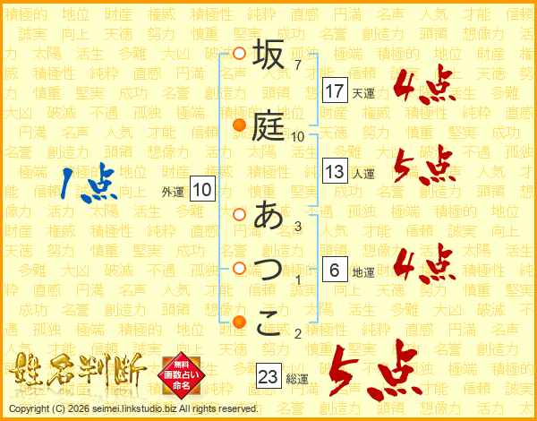 生活面を象徴する運勢です。外部から受ける影響力を表し、結婚運、家庭運や職場、環境への順応性を表します。総運から人運を引いた画数。姓や名が1文字の場合を除く。