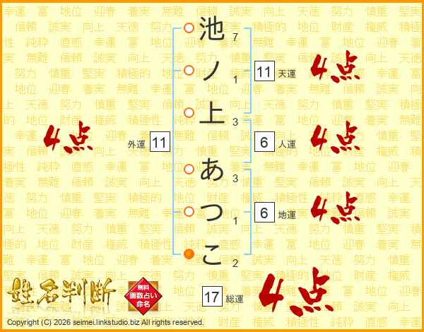 生活面を象徴する運勢です。外部から受ける影響力を表し、結婚運、家庭運や職場、環境への順応性を表します。総運から人運を引いた画数。姓や名が1文字の場合を除く。
