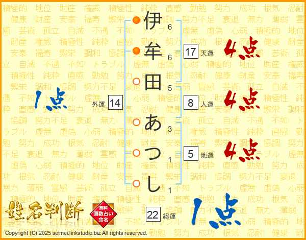 伊(6画)牟(6画)田(5画) あ(3画)つ(1画)し(1画)